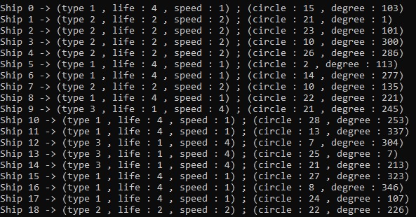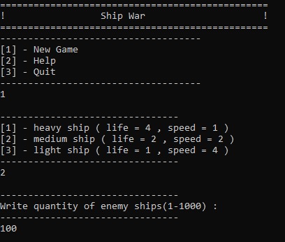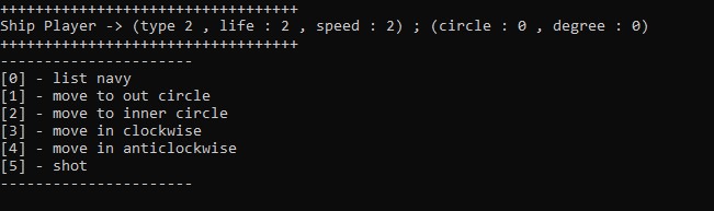 Shipwar is a text based strategy game that simulate the command of a war ship in the sea. In the game the player command one Ship against many enemy ships. The objective of the game is sunk all ships in sea. The Map is represented in polar coordinates, in other words, angle of ships and distance between ships and center of the map. There's 3 types of ships in game: light, medium and heavy. Each of these types have different numbers in attributes life and speed.